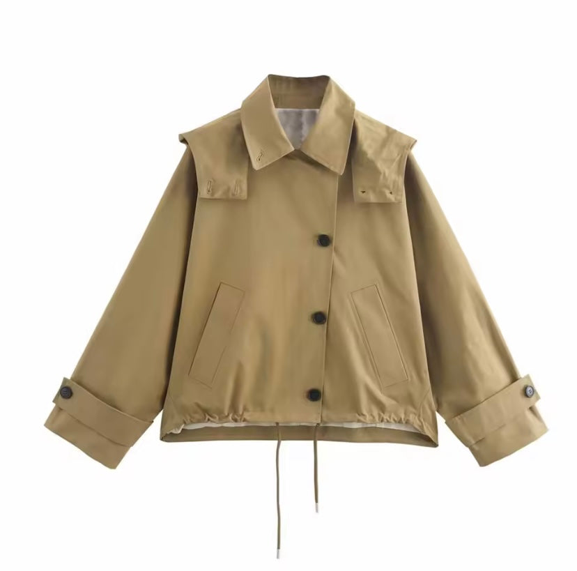 Introducing our Cropped Trench — a modern interpretation of the classic trench silhouette. Designed in a timeless khaki hue, this elegant piece blends structure and ease, making it an effortless wardrobe staple. The detachable hood adds versatility, allowing you to transition seamlessly between relaxed and refined looks. Finished with statement cuffs, sharp lapels, and a subtle drawstring hem, the Cropped Trench brings understated sophistication to any ensemble.