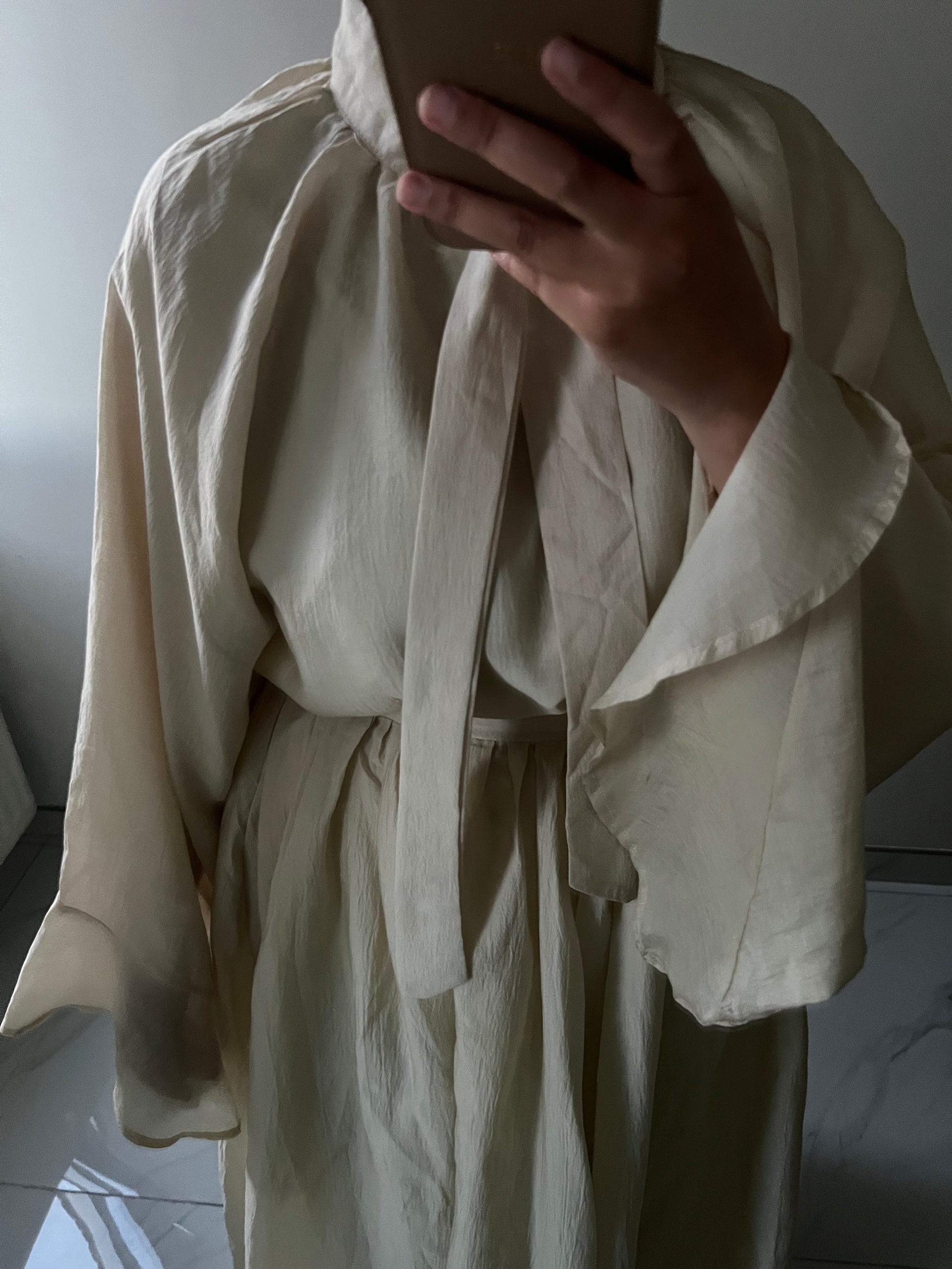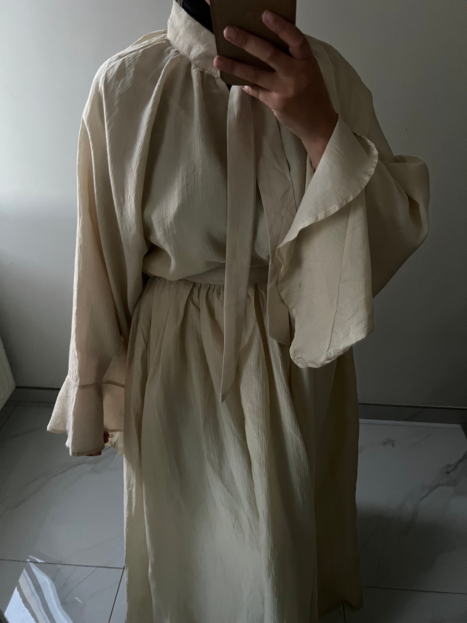 Introducing The Amalfi Set — a serene blend of effortless elegance and flowing femininity. Rendered in a soft apricot-beige tone, this lightweight set exudes sun-kissed warmth and airy charm. The A-line, high-waist skirt cascades gracefully to the ankles, perfectly complementing the long, flare sleeves of the top. The neckline features delicate twin ties, offering the freedom to knot or drape them as you wish, adding a personal touch to the fluid silhouette. Ideal for spring and summer days, this set embodies relaxed sophistication with gentle, ethereal movement.