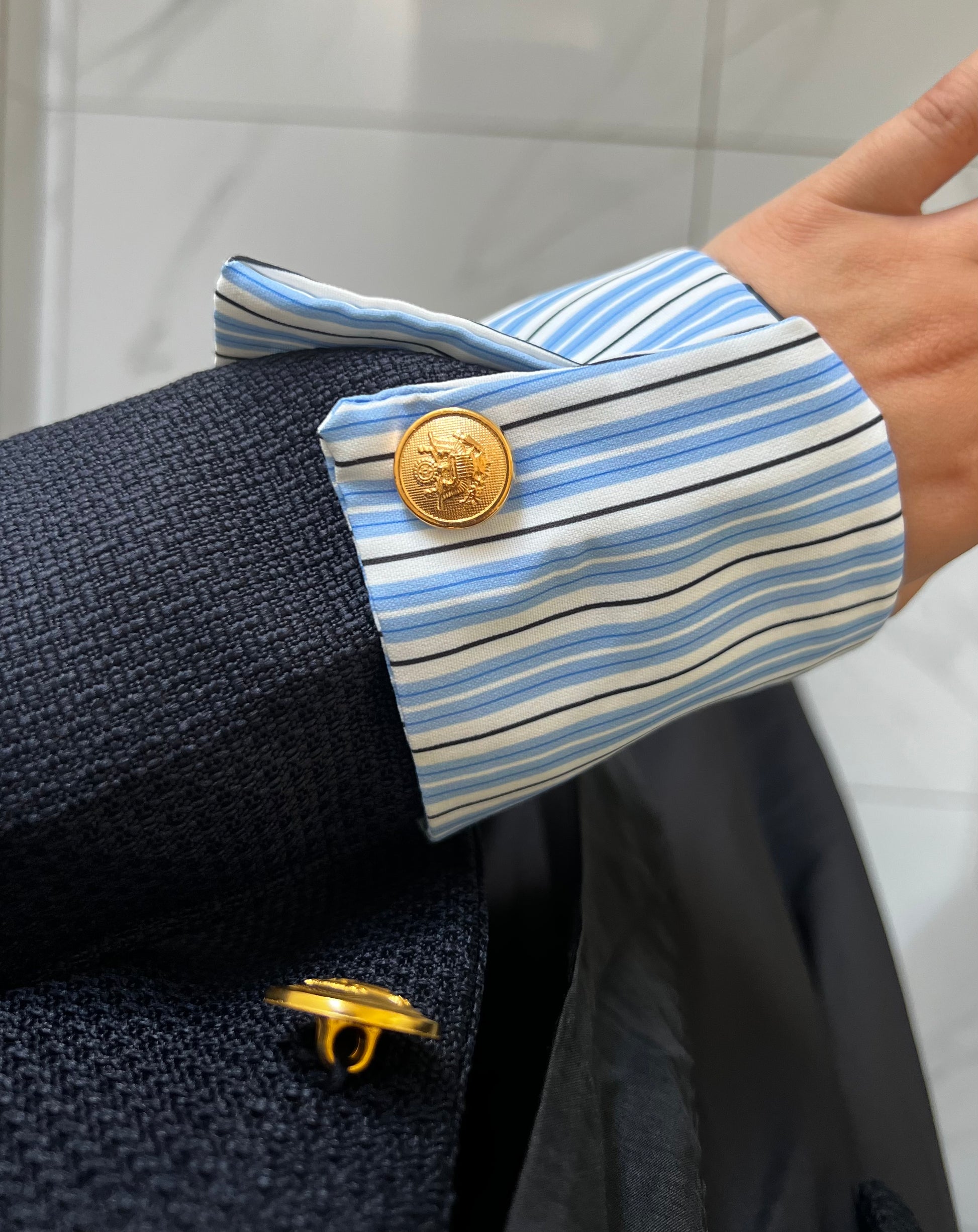 • Features: Gold-tone buttons, flap pockets, striped contrast cuffs
