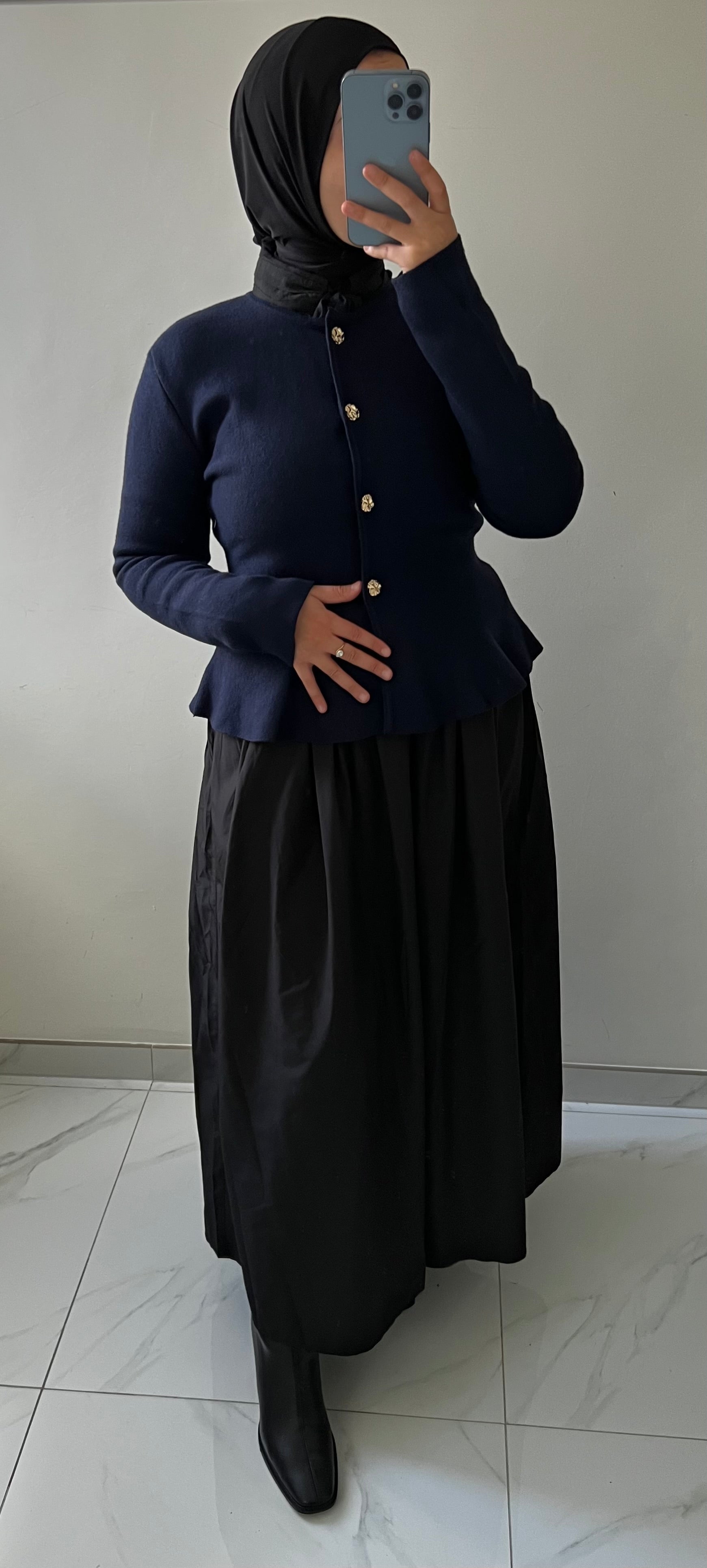 Designed in navy blue, this cardigan falls gracefully with a softly flared hemline, creating a flattering peplum-inspired effect. The gold-tone buttons add a statement of quiet luxury, making it versatile enough for both everyday wear and elevated evenings. With its elegant balance of shape and detail, The Élyse Cardigan becomes a true wardrobe essential.