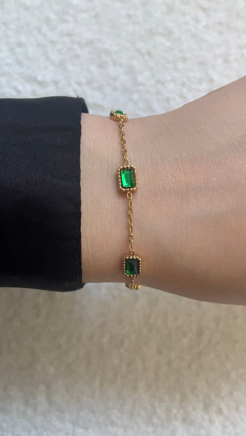 Add a pop of vibrant elegance to your style with the Verde Bracelet—a perfect fusion of modern design and timeless sophistication. Set with radiant green stones and linked by a sleek, minimalist gold chain, this bracelet is plated with a durable 18k PVD gold coating, ensuring long-lasting shine. Crafted from high-quality stainless steel, the Verde Bracelet offers both beauty and durability, while its adjustable length guarantees a perfect fit for any wrist. Perfect for adding a sophisticated touch to any outfit, the Verde Bracelet is a must-have accessory for those who appreciate refined elegance.
